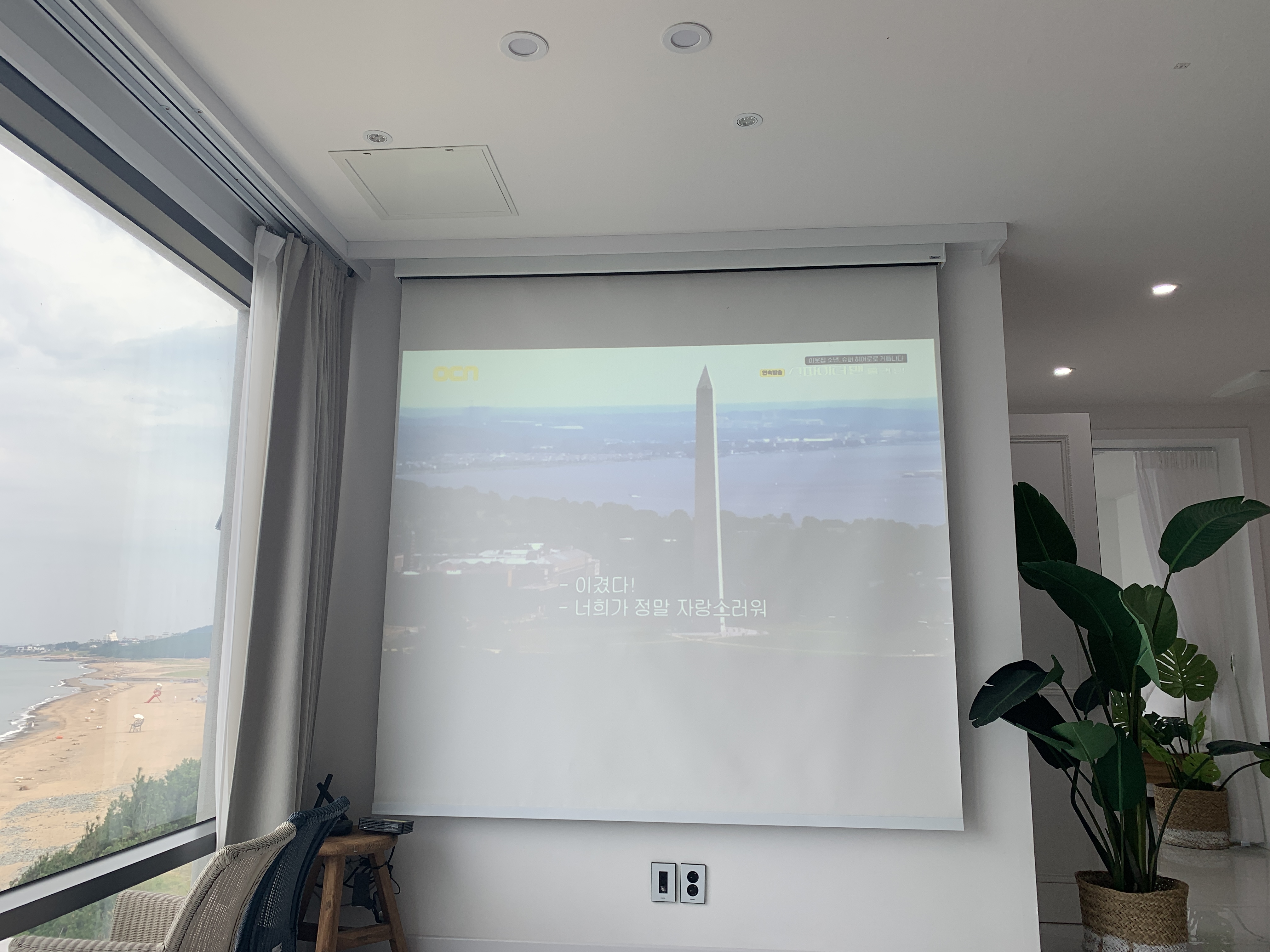 창가쪽 소파 위쪽에 빔프로젝터가 설치되어있고